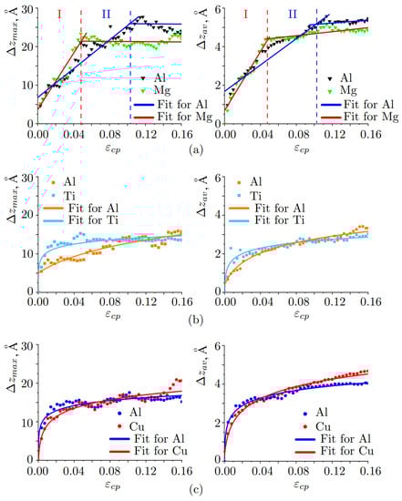 From the stress-strain curves in Figure 2a it can be seen that there are several drops connected with different structural changes and accompanied by energy changes. Stress-strain curves are divided into three regimes selected according to the main changes during deformation. Before point I elastic deformation took place for Al/Ti and Al/Cu, while for Al/Mg, an elastic regime is observed up to point II. But the point I ( = 0.04) is also set for Al/Mg for further comparison, since at this stage stress-strain curves for Al/Mg and Al/Cu almost coincide. Both curves for Al/Mg and Al/Cu interfaces have linear character, with the slope change at point II for Al/Mg and at points I and II for Al/Cu.