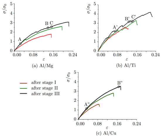 Stress–strain curves during tension normal to the interface for (a) Al/Mg, (b) Al/Ti, and (c) Al/Cu. For each composite, three stress–strain curves are presented: tension after compression at stages I (red curve), II (green curve), and III (black curve). For Al/Mg, stage I is = 0.05, stage II is = 0.102; for Al/Ti, stage I is = 0.068, stage II is = 0.107; for Al/Cu stage I is = 0.042, stage II is = 0.10; for all structures stage III is = 0.16. Letters A–C, A’–C’, A”–B” show important points on the stress-strain curves at which structure analysis will be conducted.
