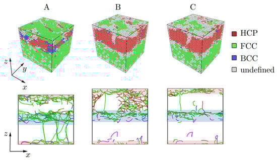The structures in Figure 2c are visualized by common-neighbor analysis (CNA): green atoms are defined as FCC lattice, blue atoms—as BCC lattice, red atoms—as HPC lattice, and gray atoms are those which have undefined coordination number. The structures in Figure 2d are visualized by the OVITO dislocation extraction algorithm (DXA) and presented as the projection to . The Stair-rod dislocation lines are colored purple, the Hirth dislocation lines are colored yellow, Frank dislocation lines are colored light blue, the Perfect dislocation lines are colored blue and the Shockley dislocation lines are colored green.