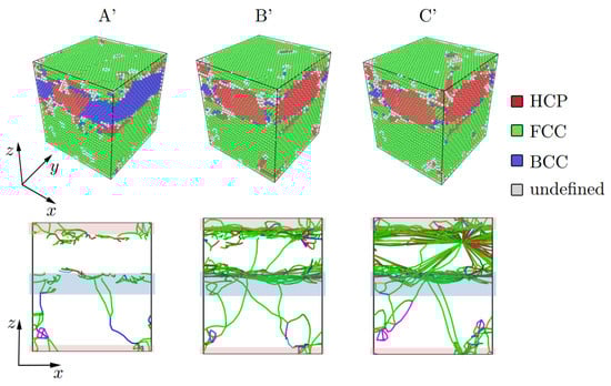 Structure representation of the Al/Ti composite based on CNA and dislocation analysis under tension. Values of strain (points A’, B’, C’) are chosen in accordance with stress–strain curves shown in Figure 8b (points A’, B’, C’). The Stair-rod dislocation lines are colored purple, the Hirth dislocation lines are colored yellow, Frank dislocation lines are colored light blue, the Perfect dislocation lines are colored blue and the Shockley dislocation lines are colored green. The boundary interface where atomic mixing took place is shown by shaded rectangles.