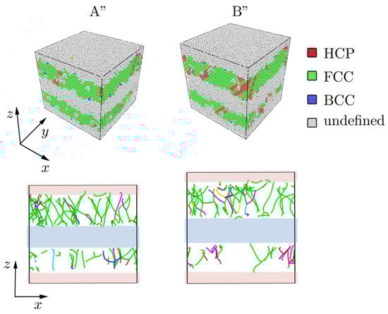 Structure representation of the Al/Cu composite based on CNA and dislocation analysis under tension at A” = 0.035, B” = 0.165. Values of strain (points A” and B”) are chosen in accordance with stress–strain curves shown in Figure 8c (points A” and B”). The Stair-rod dislocation lines are colored purple, the Hirth dislocation lines are colored yellow, Frank dislocation lines are colored light blue, the Perfect dislocation lines are colored blue and the Shockley dislocation lines are colored green. The boundary interface where atomic mixing took place is shown by shaded rectangles.