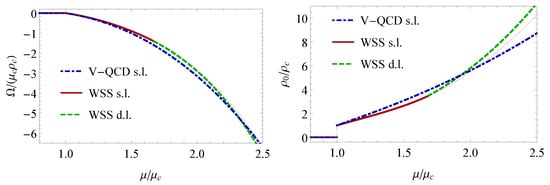 We start by analyzing the configurations in the WSS model. We set [46]) and analyze the solutions numerically (see Appendix A). As a function of the chemical potential, we find three phases (see Figure 2, where we show the grand potential and the baryon charge density as a function of the chemical potential):