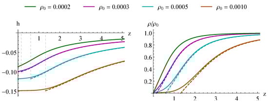 In order to have explicit parity invariance, we assume that . Following [47], we assume that the field h has a discontinuity at , denoted by the blob in Figure 1 (left), and approaches different constant values as either from above or from below. As we mentioned above, the discontinuity is required to have a non-vanishing baryon density. Defining the bulk charge density as