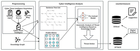 The structure of the cyber threat intelligence automatic analysis model KCTIAA based on the pre-trained model and knowledge graph proposed in this paper is shown in Figure 1. K-CTIAA can be divided into three modules, named the preprocessing module, the cyber threat intelligence analysis module, and the countermeasures module, respectively.