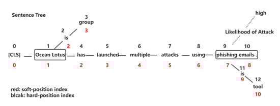 Knowledge insertion refers to inserting relevant knowledge into a sentence and affecting the semantics of the original sentence as little as possible. In fact, knowledge insertion is a complicated matter. We need to complete the embedding of knowledge semantics without affecting the sentence structure. In K-CTIAA, we use the method of constructing a sentence tree to insert knowledge into the sentence, and then convert the input of the tree structure into the input of the linear structure through specific rules, and modify the calculation method of the model to limit the interference of too much knowledge. All triples matched in the knowledge query step will be inserted into the sentence as branches. As shown in Figure 2, “OceanLotus” matches the relevant entities in the knowledge graph, and the corresponding triple “OceanLotus is group” is inserted into the original sentence as a branch. “Phishing” will be matched to multiple triples which will all be inserted into the sentence as branches.