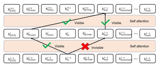 Figure 5 shows the application of the visible matrix in self-attention computation. According to the unmodified self-attention calculating rules, all are visible when calculating a certain . If we add the visible matrix in the calculation rule, the weight of part of the is set to 0 when calculating the , that is, these are on invisible state.
