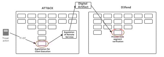 The countermeasures module is designed to advise security experts on how to respond quickly to upcoming cyber threat actions. However, due to the continuous development of cyber threats, these recommendations cannot completely replace security experts; therefore, the knowledge map of K-CTIAA needs to be updated constantly. The module was implemented by a mapping between D3fend and ATT&CK. D3FEND is a knowledge graph about cybersecurity countermeasure technologies released by MITRE Corporation. This knowledge map collects some strategies to deal with threats and classifies them according to attack techniques. As shown in Figure 8, D3fend uses digital artifacts to map to ATT&CK offensive techniques. This allows us to find the corresponding countermeasure through the mapping relationship after extracting the attack technique. We build a threat action ontology by leveraging MITRE’s ATT&CK and CAPEC efforts. Then, K-CTIAA matches the threat information output by the BERT model to the attack technique of this ontology. Specifically, K-CTIAA inputs the extracted threat information into the ontology as a query, and then calculates the similarity between each candidate attack technique and threat information according to the algorithm to find out the most likely attack technique. Finally, according to the mapping relationship of this attack technology, we can find the corresponding countermeasures of this threat action in D3defend.