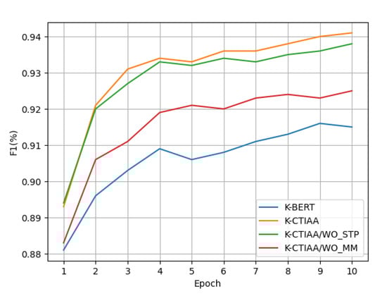 Moreover, we verify the effectiveness of our two improvements in knowledge fusion on K-CTIAA through two other experiments. K-CTIAA without sentence tree pruning is added to the experiment as a control group, and this group will be compared with K-CTIAA to verify the effect of sentence tree pruning. Likewise, we design another experiment to verify the performance improvement brought by modifying the visible matrix construction rules. A model that builds rules using the matrix visible on in Figure 4 will be compared with the results of K-CTIAA. All the experimental results are shown in Table 3 and Figure 9; K-CTIAA/WO_STP represents K-CTIAA without sentence tree pruning, and K-CTIAA/WO_MM represents K-CTIAA without visible matrix rule modification.