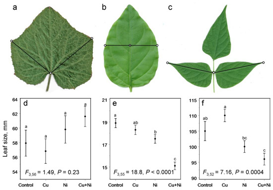 Traits measured for the calculation of leaf fluctuating asymmetry (a–c) and variation among treatments (mean ± SE, each based on 15 plants, and F/P values) in these traits in (a,d) cucumber (Cucumis sativus), (b,e) sweet pepper (Capsicum annuum), and (c,f) common bean (Phaseolus vulgaris).