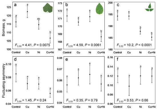 Variation among treatments (mean ± SE, each based on 15 plants, and F/P values) in (a–c) plant biomass and (d–f) leaf fluctuating asymmetry of (a,d) cucumber (Cucumis sativus), (b,e) sweet pepper (Capsicum annuum), and (c,f) common bean (Phaseolus vulgaris). Means marked by different letters differ significantly from each other (Duncan’s Multiple Range Test, α = 0.05).