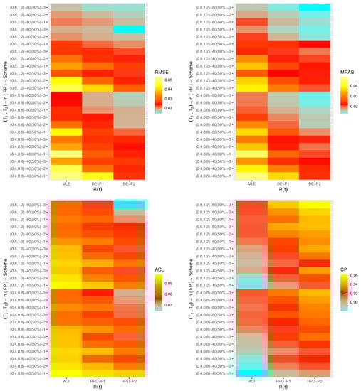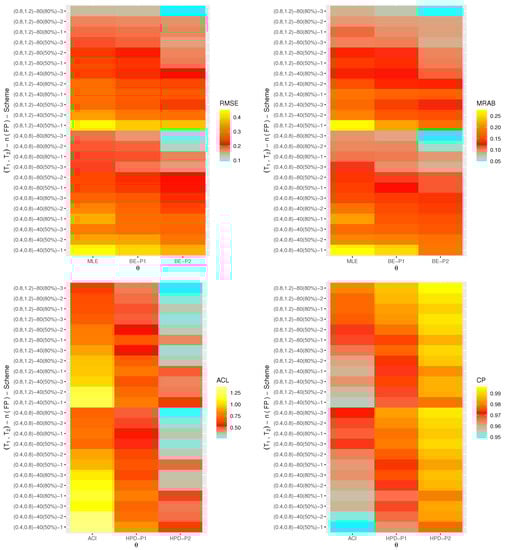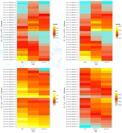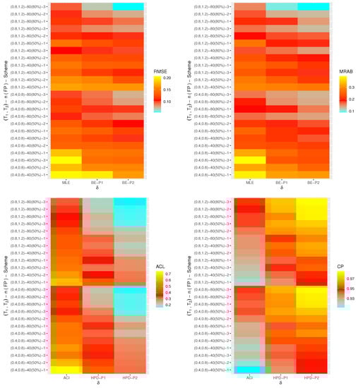 Via a heatmap data visualization in version 4.2.2 programming software (available in https://cran.r-project.org/bin/windows/base (accessed on 23 January 2023), the simulated RMSEs, MRABs, ACLs, and CPs of , , , or are shown in Figure 1, Figure 2, Figure 3 and Figure 4, respectively, while their numerical tables are available as Supplementary Materials. For specialization, some notations of the proposed methods have been defined on the “” line in Figure 1, Figure 2 and Figure 3 such that (for Prior-I (say P1) as an example) the Bayes estimates is referred to as “BE-P1” and the HPD interval estimates is denoted as “HPD-P1”.
