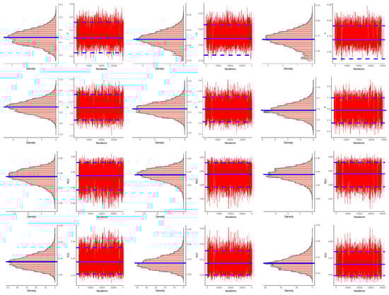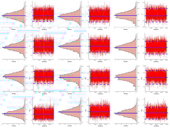 The vital statistics of , , , and , obtained based on 40,000 MCMC variates, namely, the mean, mode, median, first/third quartiles, St.D, and skewness were calculated and are listed in Table 11. Moreover, using the data sets generated by as an example, the density and trace plots of , , , and were plotted and are displayed in Figure 8. They demonstrated that the MCMC method converged effectively. It is also clear that the MCMC iterations of and were fairly symmetrical while those associated with and were negatively and positively skewed, respectively.