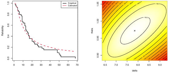 In this application, we considered a data set representing thirty successive values (in inches) of precipitation in Minneapolis–Saint Paul for the month of March, see Table 3. This data set was provided by Hinckley [31] and recently reanalyzed by Elshahhat et al. [32]. To examine whether March precipitation data fit the Fr distribution or not, the Kolmogorov–Smirnov (KS) statistic and its p-value were calculated. To establish this goal, from Table 3, the MLEs (with their standard errors (SEs)) of and were 1.0252 (0.1978) and 1.5496 (0.2027), respectively, meanwhile the KS (p-value) was 0.1524 (0.489). It means that the Fr lifetime model fit the March precipitation data well. Using a graphic visualization, based on the complete March precipitation data, Figure 5 displays (i) the estimated and empirical RFs and (ii) the contour of the log-likelihood function with respect to various choices of and . It supported the same findings as the KS test and showed that the MLEs and existed and were unique.