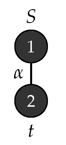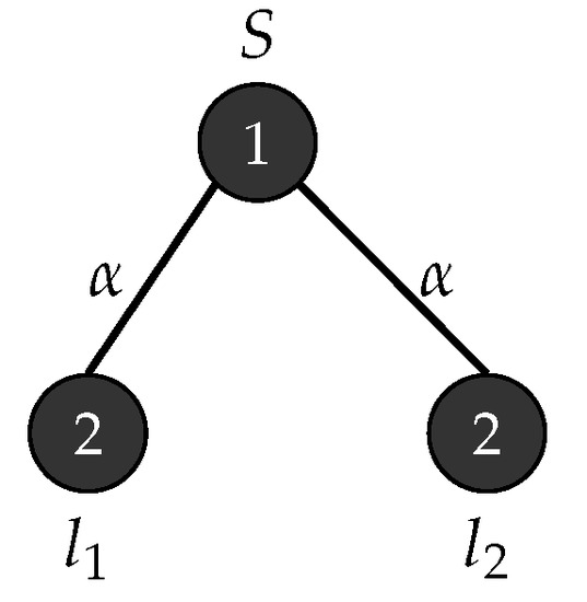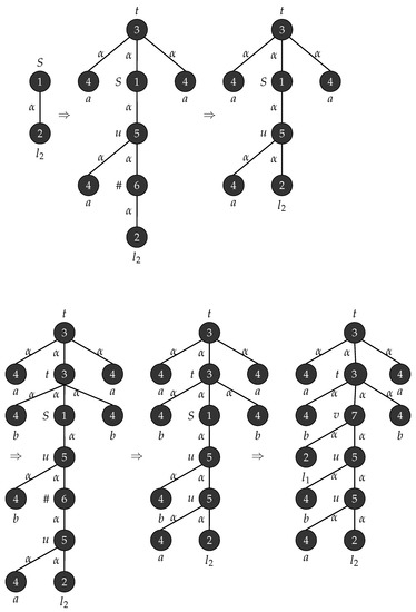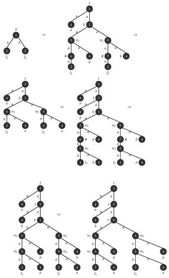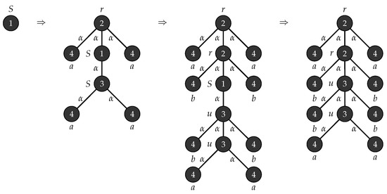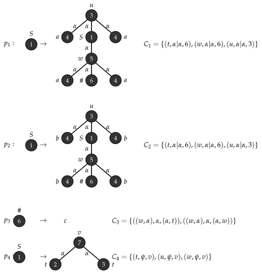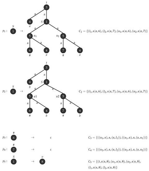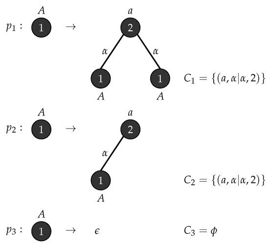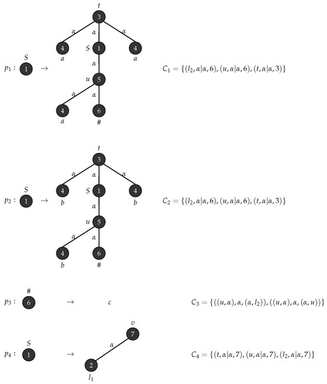 Consider with , , , , , consists of a single mode labelled S and . Figure 1 depicts the production rules that generates parse trees with the yield and Figure 2 demonstrates the application of these rules when .