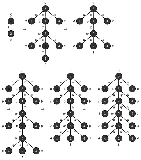The graph grammar in Example 2 can generate parse trees with yield of the form . Figure 5 shows the derivation of tree yielding the string which is obtained when .