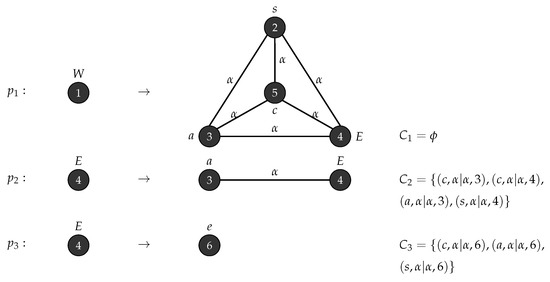 Consider with , , , , , is the graph in Figure 17 and . Figure 18 depicts the production rules that generate parse trees with the yield . Figure 19 shows the application of these rules when .