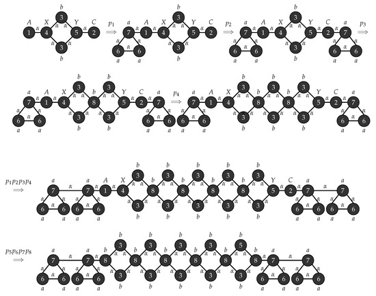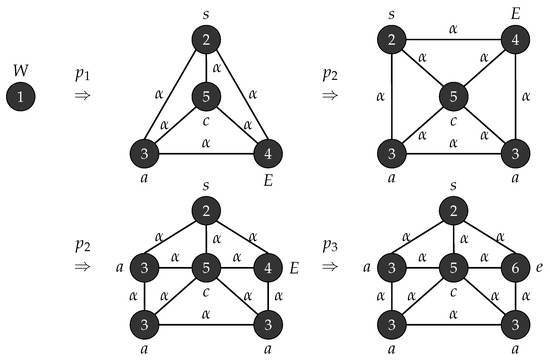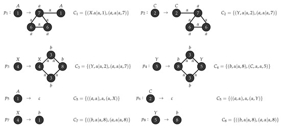 Consider the graph grammar , with , , , , , is the graph shown in Figure 3 and . Figure 4 depicts the production rules that generates a parse tree with the yield . Figure 5 shows the application of these rules when .