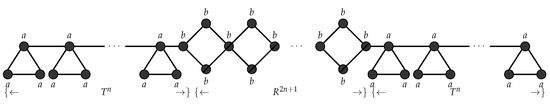 Consider a graph language consisting of graphs of the form shown in Figure 10. This graph can be interpreted as follows: Each graph contains a series of n hanging triangles T followed by a series of rhombuses R glued together and followed again by a series of n hanging triangles T. This graph language can now be represented using the string language . It is known that the language L is not context free. Based on this feature of non-contextfreeness it can be shown that any graph language of this form cannot be generated using an edge and node controlled embedding graph grammar. The production rules can be applied in any order and a single node replacement happens when we apply a rule. Hence any grammar of this type will generate certain graphs which are not in the required form. We now show that this graph language can be generated using a non-confluential edge and node controlled embedding graph grammars as follows. Consider an - , , , , , , is the graph in Figure 11 and . Figure 12 shows the production rules and the associated connection instructions for generating the pattern of the form . Figure 13 shows the derivation of the pattern of the form . □