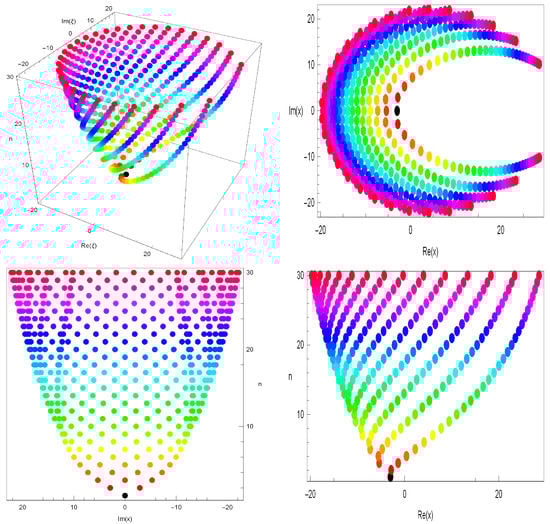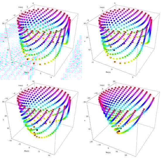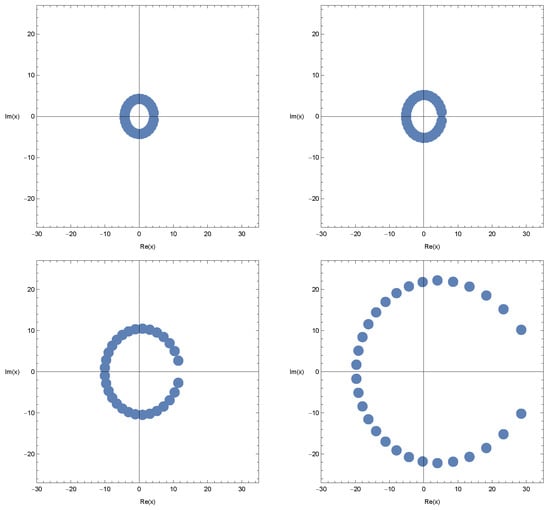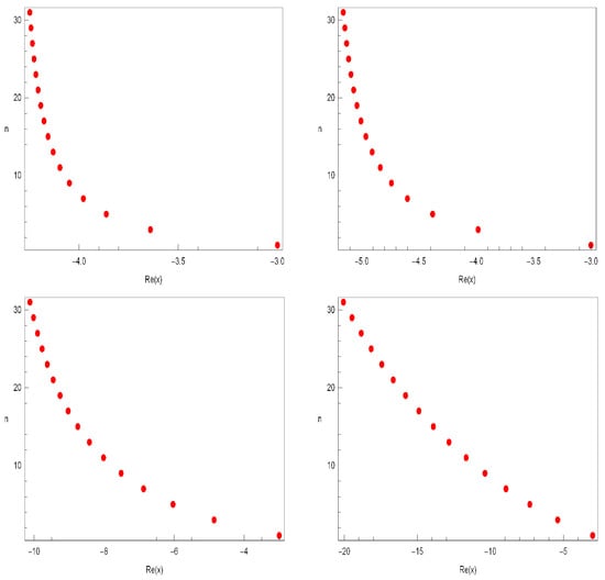 By choosing , the zeros of the aforementioned polynomials are represented by the following Figures.