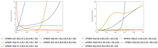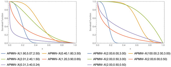 The addition of the three parameters to the family shows a significant effect on the diversity of SF as in Figure 1. The Weibull model became very flexible after the APMW-X family parameters were added. Sometimes, it resembles a bell curve with some torsion and at other times it seems to have strong swings as seen in Figure 3, which depends on the specific values of the parameters. The proposed model is a good candidate for data modeling in various financial, industrial, medical and other applications. However, it can be seen from Figure 3 that APMW-W has simple features and an elastic failure rate. The simple hazard rate and flexible features are another superiority of the proposed model along with its heavy-tail behavior.