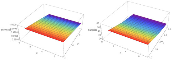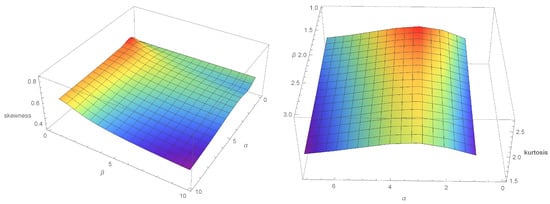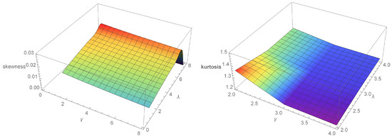 Some quantile values for and are shown in Figure 5. The skewness obtained is 0.592713, and the kurtosis is 2.19598 for the same case shown in Figure 5. Table 1 shows some quantile values for the same case. Figure 6, Figure 7 and Figure 8 show the SK and K for some cases of APMW-W .