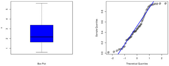 The data set of 50 carbon dioxide emissions for the period (1970–2019) given by Albank Aldawli for Saudi Arabia is considered as an application of the APMW-W distribution. Table 4 shows the descriptive statistics of the data for carbon dioxide emissions . The boxplot and Q-Q plot are shown in Figure 9. Figure 10 shows the fitted PDF of APMW-W and CDF. Figure 11 shows the PP plot and the Kaplan–Meier survival function of APMW-W.