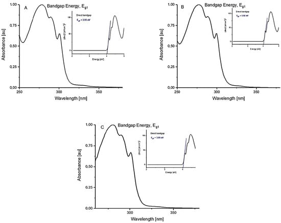 Tauc’s plot of (αhν)2 as a function of photon energy (hν) for the 2-(benzothiazolylothio)ethyl acrylate (1) in selected solvents of different polarities ((A) dichloromethane, (B) methanol, and (C) dimethyl sulfoxide).