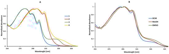 Normalized absorption spectra of 1–4 in methanol (A) and normalized absorption of 2-(2-(6-ethoxybenzothiazolyl)thio)ethyl methacrylate (4) in solvents of different polarities (B) (values were converted to have the maximum normalized at 1).
