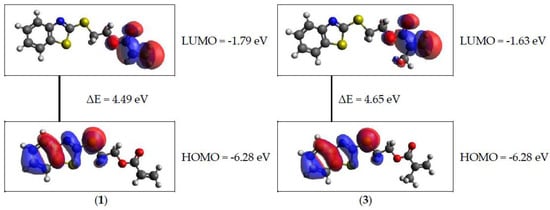 Based on the obtained data, it can be concluded that among all the molecules under consideration, the derivatives containing the ethoxy substituent show the greatest reactivity. Such molecules were characterized by the lowest values of hardness and energy gap (Table 5). Moreover, the lower values of energy gap of 2-(2-benzothiazolylthio)ethyl acrylate derivatives (1, 2) may indicate that they are more reactive than 2-(2-benzothiazolylthio)ethyl methacrylate derivatives (3, 4) (Figure 4). No clear effect of the solvent polarity was observed on the calculated parameters.