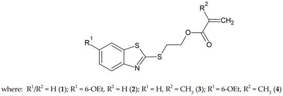 Synthetic polymers gained high attraction for technical as well as for medical application for various reasons. A wide range of physical and chemical properties can be achieved based on the monomer units, polymerization reaction, and formation of co-polymers consisting of different components at adjustable concentrations [15]. Synthetic methodologies that have enabled the production of well-defined and functionalized polymers play a key role in this research area. In this study, a light-sensitive photoinitiator (meth)acrylic of 2-mercaptobenzothiazole derivatives with different substituents were designed and synthesized. According to the literature, some of these compounds can act not only as photoinitiators but also as attractive building blocks and components of advanced polymer materials characterized by a high refractive index, for optical, e.g., as foldable intraocular lenses [16], and for industrial applications (coatings) [17,18].