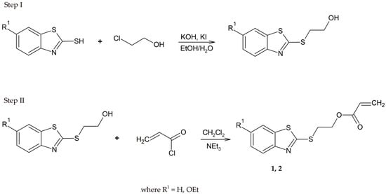 In recent years, several methods have been reported for the synthesis of acrylate and methacrylate derivatives of 2-mercaptobenzothiazole [16,17,18,26]. The treatment of 2-mercaptobenzothiazole with chloroethanol in the presence of potassium hydroxide and potassium iodide causes its transformation into 2-(2-benzothiazolylthio)ethanol. The purified intermediate product was always used in the subsequent synthetic step. The second step involved the esterification of 2-(2-benzothiazolylthio)ethanol with acrylate chloride (Scheme 2).