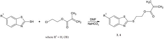 The 2-(2-benzothiazolylthio)ethyl methacrylate derivatives (3, 4) were synthesized in one step by refluxing the 2-mercaptobenzothiazole with 2-chloroethyl methacrylate (Scheme 3).