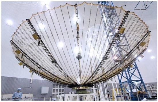 Example of an antenna in the form of a grid of wires as a transformable antenna with gilded wire mesh (mounted on Luch 5A, Luch 5B, and Luch 5V) [259].