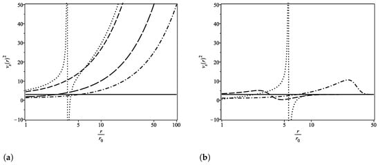 the behavior of these solutions as a function of is plotted in Figure 8. In this approximation order, as we see in Figure 8, the global (dashed line) and radial (dotted line) cases differ little from each other. This is why the values in these cases are close. This difference, close to the throat , becomes negligible.