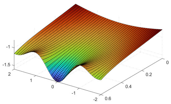 The linear part is , and the nonlinear part is . Applying LHPM into Equation (24) and following the steps in a previous section with MATLAB help leads to the following value of :