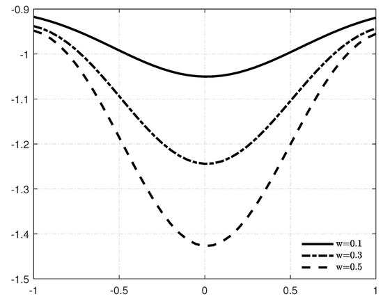 Figure 3 demonstrates the dependence of the modified Kawahara solution on the damping coefficient w. We obtain the rarefaction wave or negative wave. In Figure 4, it is obvious that when the damping term w is increased, the amplitude of the wave decreases. Equation (4) has been solved by the ansatz method, and this method used a suitable hypothesis based on the exact solutions for non-damped mKE [30]. However, the ansatz method is an analytical method, which assumes the solution in ansatz and requires some specific computations to find unknown functions in the ansatz. The comparison between the ansatz method and LHPM reveals that LHPM is a numerical method and only requires initial conditions.