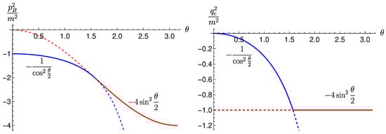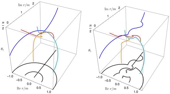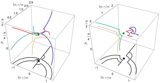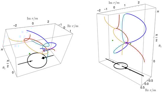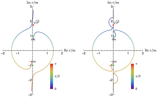 Based on the left plot in Figure 2, one might wonder what happens when p moves onto the imaginary axis, or, equivalently, when is negative. Does the branch cut then go over the pole? If the angular integration is performed in a straight line from 0 to , it indeed does, but we can also deform the integration contour for the angular integral. An example of this is shown in the right plot of Figure 2. Two observations should be made. First, this explains the relevance of the endpoints for Equation (3) because they cannot be moved around in contradistinction to the integration path between endpoints. Second, if the contour is deformed to avoid a pole in one place, it introduces deformations elsewhere as well.