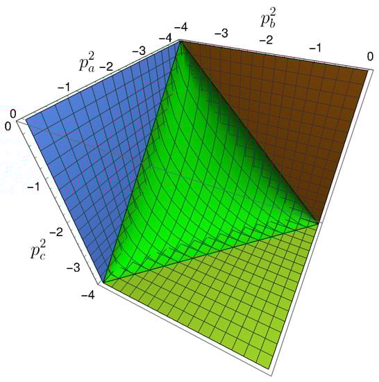 It remains to be determined which of the two possibilities leads to the critical point closer to the origin and thus to the relevant threshold. For the case with two propagators, one can determine the touching point to be at . The case with three propagators, on the other hand, has the critical points at . Thus, they create the highest threshold if , and the two propagators create them otherwise. The final threshold surface is thus parameterized by the walls at and the surface created by :