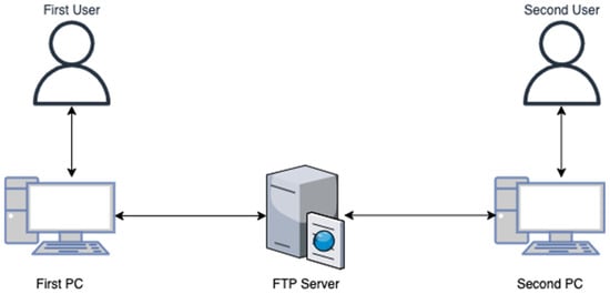 The developed model allows us to build a scheme of information flows, which, in addition to allowed flows, will include all possible manifestations of prohibited ones. We applied the information flow model to describe the process of exchanging electronic documents between two users via an FTP server (the general scheme of the described process is shown in Figure 3).