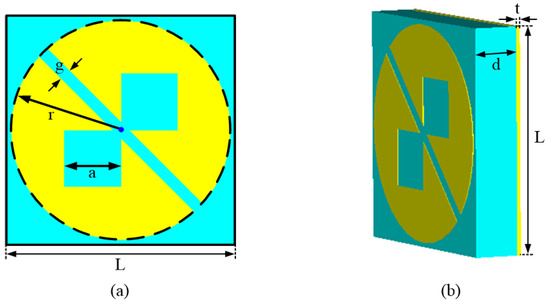 Figure 1 shows the dimensional parameters of the suggested metasurface-based reflective-type polarization converter design, which has a topology on a FR-4 substrate material with a metasurface metallic patterns on its front surface and an all-metallic surface termination on its bottom surface. The suggested metasurface cell consists of a circular structure with radius 3.85 mm (r), a rectangular structure with width 0.4 mm (g) at angle of 45 with the horizontal, and a subtracted version of two squares with a side length of 2 mm (a) at the origin. Its lower and upper layers consist of copper with a thickness (t) of 35 m and an electrical conductivity () of 5.8 S/m. In the middle layer, there is a widely used cheaper FR-4 substrate material with a thickness (d) of 1.6 mm, a loss tangent (tan ) of 0.025, and a dielectric constant () of 4.3. This layer is square in shape with a side length (L) of 8 mm. Table 1 sums up the values of the suggest polarization converter geometry parameters.