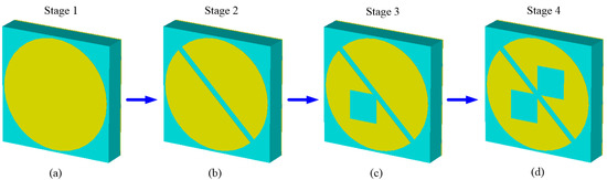 The stages involved in the geometric design of the suggested polarization converter: (a) Circular structure (Stage 1), (b) metasurface unit cell created by removing a rectangular patch from the circular structure (Stage 2), (c) the metasurface unit cell created by removing a rectangular and a square patch from the circular structure (Stage 3), and (d) the metasurface unit cell created by removing one rectangular and two square patches from the circular structure (Stage 4: The suggested polarization converter geometry in Figure 1).