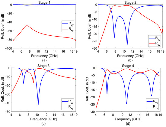 Comparison of co- and cross-reflection coefficients ( and ) by changing the geometry of an efficient polarization converter design suggested in Figure 1: (a) Stage 1, (b) Stage 2, (c) Stage 3, and (d) Stage 4.
