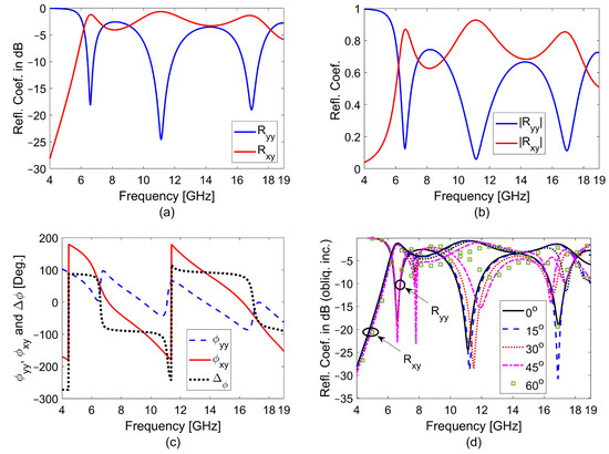 Simulations for the suggested metasurface-based polarization converter design were carried out with a commercial 3D EM simulation program (CST Microwave Studio) in the broader frequency region of 4–19 GHz by choosing a 30 × 30 tetrahedral mesh type. Figure 5a,b shows the simulated co- and cross-polarization coefficients ( and ) for the incoming y-polarized wave under normal incidence of the suggested polarization converter in dB and amplitude, respectively. While Figure 5c shows the phase difference () between the reflection phases ( and ) and and for co- and cross-polarization under again normal incidence, Figure 5d shows co- and cross-polarization reflection coefficients for four different incidence angles—15, 30, 45, and 60—in addition to normal angle of incidence (0) for transverse electric (TE) wave. The following points are noted from the results of Figure 5a–d. First, as noted from Figure 5b, the for normal incidence is bigger than 0.85 in three different frequency bands of 6.46–6.78 GHz, 10.52–11.85 GHz, and 16.49–17.37 GHz and has received lower than 0.25 in the same frequency ranges. Secondly, as seen from Figure 5c, has a larger frequency change compared with the frequency change of , meaning that the suggested polarization converter design has different values with frequency. Thirdly, as seen from Figure 5d, for angles of incidence up to 60, the has not fallen down −8 dB around the three frequency range zones mentioned above. However, with the increase in the oblique incidence, the bandwidth decreased and the performance of the polarization converter deteriorated above 45, as shown in Figure 5d. When the incidence angle increases, the effective impedance of the polarization converter changes [25]. This impedance change affects the interaction of the incident wave with the converter. Due to the reduced interaction, the performance (bandwidth) of the polarization converter partially decreases with an increase in the incidence angle.