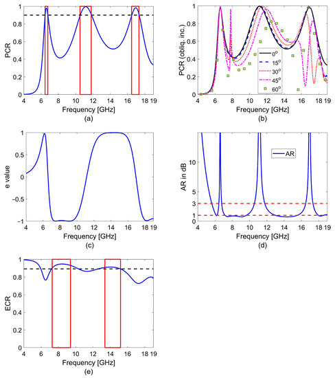 Calculated values from the simulated co- and cross-polarization reflection coefficients ( and ) for suggested polarization converter: (a) PCR value for normal incidence and (b) PCR values for four different angles of incidence (15, 30, 45, and 60) in addition to the normal incidence, (c) e value for normal incidence, (d) AR value for normal incidence, and (e) ECR value for normal incidence.