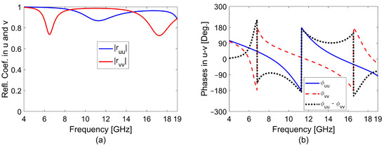 To verify the status of the LP converter, it was specified in Section 2 that and . Figure 7a, the simulated u- and v-axis reflection coefficients sizes of suggested polarization converter shows respectively variation of and versus frequency. From Figure 7a, and are not smaller than 0.8 in all frequency band (except for between 6.23–6.78 and 16.42–18.07 GHz). Figure 7b shows the reflection phases ( and ) and the phase difference () along the frequency in the u- and v-axis. It may be seen from Figure 7b that has a sharp phase change at around 11.3 GHz and at 6.80 and 16.55 GHz frequencies. It is also seen that is about ±180 along 6.46–6.78, 10.52–11.85, and 16.49–17.37 GHz, about −90 (the region where LHCP occurs) along 7.28–9.40 GHz, and +90 (the region where RHCP occurs) in the range of 13.38–15.19 GHz. This shows that the suggested polarization converter operates as both LP and CP converter.