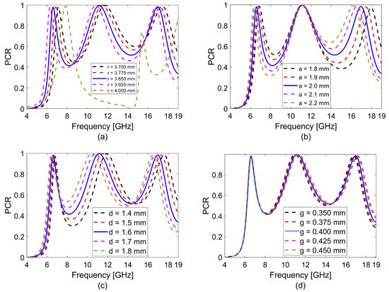 A parametric analysis was performed to analyze the effect of the geometric parameters of the suggested polarization converter on the polarization conversion performance and finally to reach the optimized structure shown in Figure 1, namely, the dimensions in Table 1. For this analysis, the r, a, d, and g dimensions in Figure 1 were changed separately, while the other parameters were kept constant. Accordingly, the PCR values for variation in the ranges of r = 3.7–4 mm, a = 1.8–2.2 mm, d = 1.4–1.8 mm, and g = 0.35–0.45 mm for both the widest PCR bandwidth and high performance are shown in Figure 8a–d. In order to obtain the highest polarization conversion and the widest bandwidth in the C-, X-, and Ku-bands from Figure 8a–d, it has been optimized as r = 3.85 mm, a = 2 mm, d = 1.6 mm, and g = 0.4 mm, as previously given in Table 1.