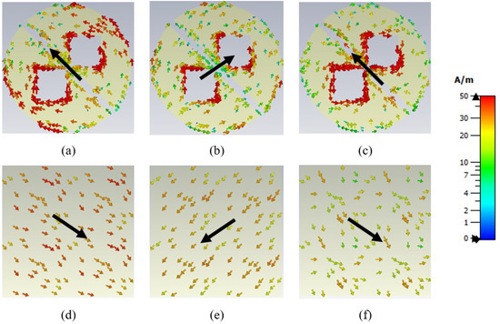 Figure 9a–f shows the surface current distributions on the ground (Figure 9d–f) and metasurface-based resonator (Figure 9a–c) at resonant frequencies, i.e., 6.575, 11.125, and 16.925 GHz. In addition, in Figure 9, while the head of the arrow shows the direction of the current on the surface, if the current distribution in the metasurface-based resonator and ground are in phase (parallel), electric dipole resonance will occur, otherwise, magnetic resonance will occur if it is out of phase (anti-parallel) [26]. When the surface current distributions of the designed polarization converter in Figure 9a–f are studied, it is seen that the currents in the ground and in the resonator feature opposite directions, that is, the suggested converter design has magnetic resonance at f = 6.575, 11.125, and 16.925 GHz at all three resonance frequencies.