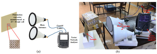 The simulation results of suggested polarization converter were compared and verified in the context of the data obtained with the free-space measurements of the polarization converter produced by the traditional board manufacturing method. Measurements were carried out in the microwave range of frequencies from 8 to 12 GHz (in the X-band) due to limited laboratory facilities. The suggested polarization converter was fabricated as a 25 × 36 (200 mm × 288 mm) unit cell. For free-space measurements, as shown in Figure 10a, Keysight Technologies N9918A (30 kHz–26.5 GHz) brand and model of the vector network analyzer (VNA), two Flann Microwave 16820-PB lens horn antennas operating at X-band with maximum 1.5 voltage standing wave ratio (VSWR) value, and two 1.2 m coaxial cables were used. The distance between the front and rear face apertures of the sample is manually adjusted to approximately 40 cm according to the antenna manual [27]. The horn-lens antennas used in the measurement setup had the capability of focusing EM signals onto the sample (polarization converter). As a result of such feasibility, diffraction effects around the fabricated polarization converter (200 mm × 288 mm) were assumed to be negligible in amount, which was also validated by reflection measurements with similar results implemented with a few pyramidal microwave absorbers positioned next to the converter. The experimental environment in which real-time measurements were made is as shown in Figure 10b. In addition, a widely used and easily implemented calibration technique “thru-reflect-line (TRL)” [28] was employed to remove systematic errors in the measurement system [27,29,30]. The horn antennas used to transmit EM waves to the fabricated metasurface and receive the reflected waves from the metasurface were placed in the horizontal direction for co-polarization measurement and the receiving antenna was placed in the vertical direction for cross-polarization measurement [26]. The measurement setup was arranged in such a manner that co- and cross-polarized reflection coefficients could be comfortably measured with a high accuracy. To this end, a bi-static measurement configuration was implemented [31]. In performing oblique incidence measurements for such a configuration, we positioned the surface of the polarization converter in reference to the aperture of the transmitting antenna in such a manner that the angle between the front surface of the converter and the aperture of the transmitting antenna corresponds to the intended oblique incidence angle. Then, the aperture of the receiving horn antenna was arranged for the same incidence angle (reflected angle due to the Snell’s law of reflection). Due to the physical dimensions of the transmitting and receiving antennas, the minimum incidence angle that could be measured by the constructed setup was around 5 degrees, which in many applications could be considered as the normal incidence case.