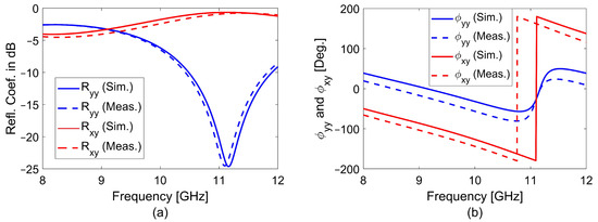 The measured co- and cross-reflection coefficients and phases were compared with the simulated results as shown in Figure 11a,b. As seen in Figure 11a,b, it was observed that the measured and simulated results were compatible with each other in the 8–12 GHz frequency range. We think that small frequency shifts and amplitude changes in measured and simulated co- and cross-reflection coefficients and phases arise mainly due to fabrication tolerances, background noises, and/or antenna misalignment [32]. Although we present measurement results of co- and cross-reflection coefficients and phases at X-band only (due to insufficient facilities in the laboratory), we expect good agreement between measured and simulated coefficients at C- and Ku-bands.