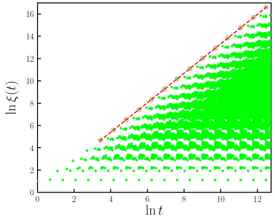 with the exponent governing the asymptotic power-law decay [28,29]. Although early numerical assumptions predicted a value of close to , more precise approaches estimated this value as , from which is obtained [30,31,32]. Numerical results are shown in Figure 2. In order to reach the analytical result, we need to take the limits and . However, our computer limitations allow us now to achieve , and this order of magnitude yields the approximative value for small time steps, provided that the ratio is large enough. In addition, due to the fact that the number of boxes is very small, the curve saturates. On the other hand, as we increase the number of boxes, because M stays constant due to computer limitation, this ratio decreases. This makes the initial part of the curve slightly depart from the theoretical result though the final part goes farther before saturation and stays closer to the analytic curve (black dotted line).